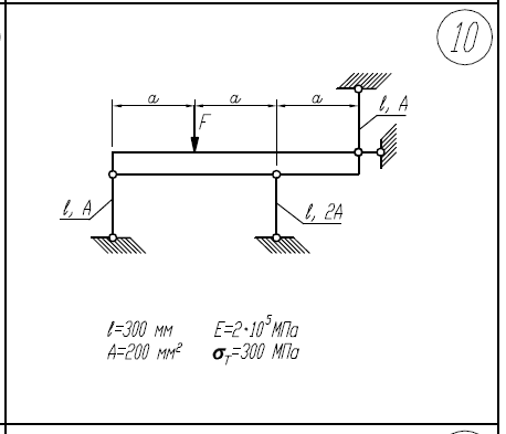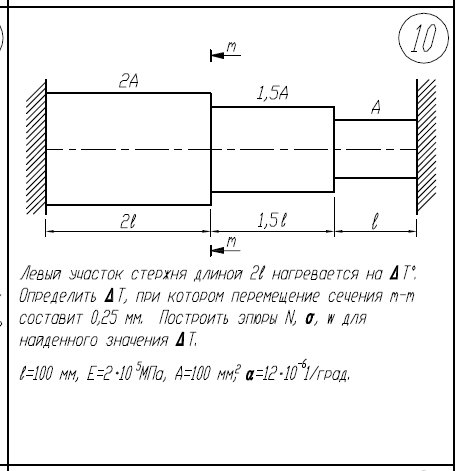 1)Левый участок стержня длиной 2l нагревается на ΔT. Определить ΔT, при котором перемещение сечения m-m составит 0,25 мм. 2)Построить эпюры N,σ,w для найденного значения ΔT. l=100мм; E=2*105/МПа; A=100мм2/; α/ст=12*10-6/1/град 1)Определить нагрузку, при которой в стержневой системе возникают первые пластические деформации. 2)Найти напряжения, возникающие в стержнях при найденной нагрузке. l=300мм; E=2*105/МПа; A=200мм2/; σ/Т=300МПа 1)Построить эпюры М/к, τ/max, φ. 2)Найти коэффициент запаса n/Т. М=10Нм; τ/Т=200МПа; d=10мм; l=400мм; G=8*104/МПа.