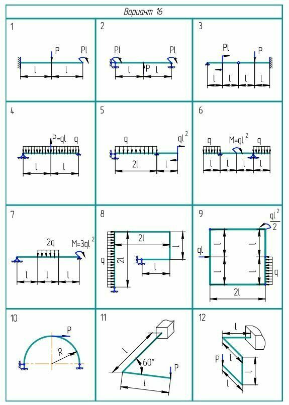 Вариант 16 - ДЗ №1 - Построение эпюр внутренних силовых факторов - 12 Задач
