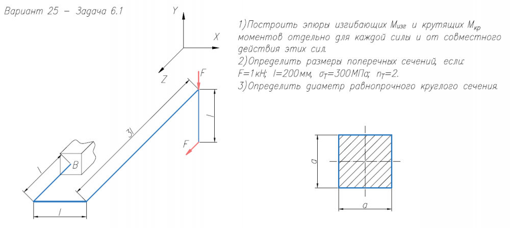 Задача 6.1 Построить эпюры изгибающих M/изг и крутящих M/кр моментов отдельно для каждой силы и от совместного действия этих сил. 2)Определить размеры поперечных сечений, если: F=1кН; l=200мм, σ/Т=300МПа; n/Т=2. 3)Определить диаметр равнопрочного круглого сечения. Задача 6.2. Для деталей, изображенных на чертежах и указанных в тексте задач, требуется: 1)Определить напряженное состояние в наиболее нагруженных точках. 2)Исследовать напряженное состояние в этих точках аналитически и графически. 3)Определить коэффициент запаса. Тонкостенная замкнутая трубка подвергается действию внутреннего давления P и моментов M, изгибающих трубку. Изучить напряженное состояние трубки в области, достаточно удаленной от ее концов.