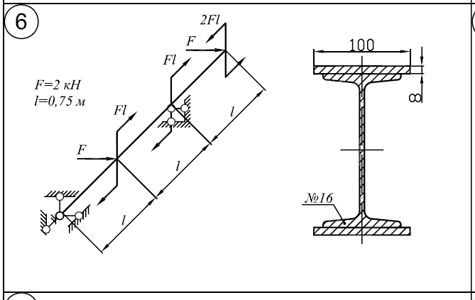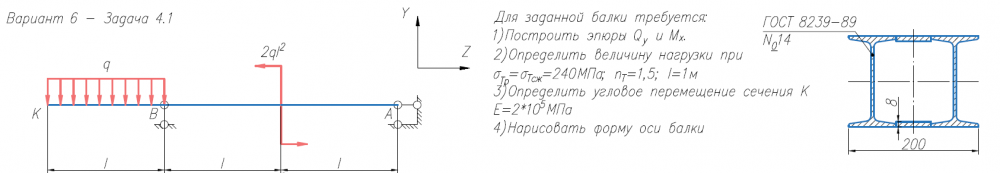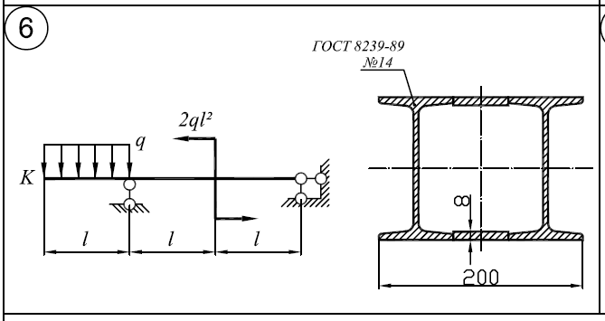Для заданной балки требуется: 1)Построить эпюры Q/y и M/x. 2)Определить величину нагрузки при σ/Тр=σ/Тсж=240МПа; n/Т=1,5; l=1м 3)Определить угловое перемещение сечения К E=2*105/МПа 4)Нарисовать форму оси балки Для заданной балки требуется: 1)Построить эпюру моментов 2)Вычислить наибольшее нормальное напряжение в опасном сечении и определить коэффициент запаса по текучести (σ/Т=240МПа) 3)Построить эпюру нормальных напряжений в опасном сечении, изобразив сечение в масштабе 1:1 .