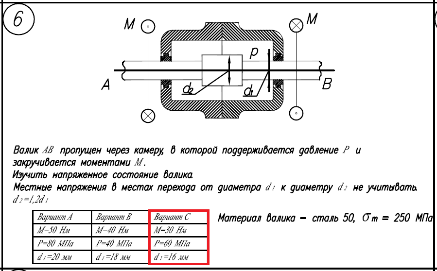 d/2=1,2d/1 Материал валика - сталь 50, σ/Т=250МПа; Вариант C: M=30Нм; P=60МПа; d/1=16мм..