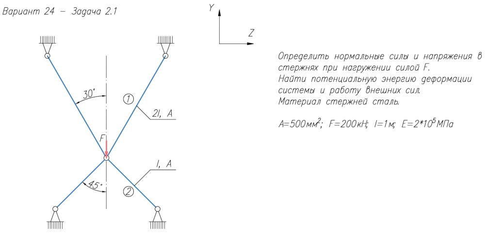 Определить нормальные силы и напряжения в стержнях при нагружении силой F. Найти потенциальную энергию деформации системы и работу внешних сил. Материал стержней сталь. А=500мм2/; F=200кН; l=1м; E=2*105/МПа  1)Определить нагрузку, при которой в стержневой системе возникают первые пластические деформации. 2)Найти напряжения, возникающие в стержнях при найденной нагрузке. l=300мм; A=400мм2/; σ/Т=200МПа; E=2*105/МПа 1)При каком значении момента М/1 угол поворота сечения С равен нулю? 2)Для найденного значения М/1 построить эпюры М/к, τ/max, φ. 3)Определить размеры поперечного сечения вала, если: [τ]=80МПа; М=120Нм; l=0,16м; G=8*104/МПа; δ=d/15.