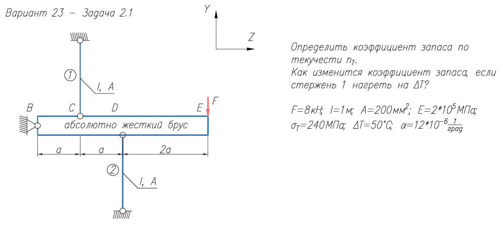 Определить коэффициент запаса по текучести n/Т. Как изменится коэффициент запаса, если стержень 1 нагреть на ΔT? F=8кН; l=1м; A=200мм2/; E=2*105/МПа; σ/Т=240МПа; ΔT=50°С; α=12*10-6/1/град 1)Определить силу F, при которой в системе возникнут первые пластические деформации. 2)Построить эпюры N,σ,w для стержня и трубки при этом значении силы F. l=200мм; A=100мм2/; E=2*105/МПа; σ/Т=300МПа   При каком значении момента Х вал будет равнопрочным? Для найденного значения Х построить эпюры М/к, τ/max, φ. Вычислить коэффициент запаса по текучести, если: τ/Т=240МПа; d=0,01м=10мм; М=140Нм; l=0,5м=500мм; G=8*104/МПа.