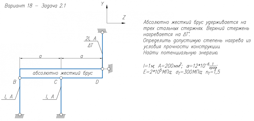 Абсолютно жесткий брус удерживается на трех стальных стержнях. Верхний стержень нагревается на ΔT°. Определить допустимую степень нагрева из условия прочности конструкции. Найти потенциальную энергию. l=1м; A=200мм2/; α=12*10-6/1/град; E=2*105/МПа; σ/Т=300МПа; n/Т=1,5 1)Определить нагрузку, при которой в стержневой системе возникают первые пластические деформации. 2)Найти напряжения, возникающие в стержнях при найденной нагрузке. l=100мм; A=400мм2/; E=2*105/МПа; σ/Т=200МПа 1)При каком соотношении моментов M/1/M/2 угол поворота сечения В будет в 2 раза больше, чем сечения С? Постро 2)Построить эпюры М/к, τ/max, φ 3)Из расчета на прочность вычислить значения моментов M/1 и M/2, если: τ/Т=240МПа; d=0,02м=20мм; n/Т=2; l=0,08м=80мм; G=8*104/МПа  .