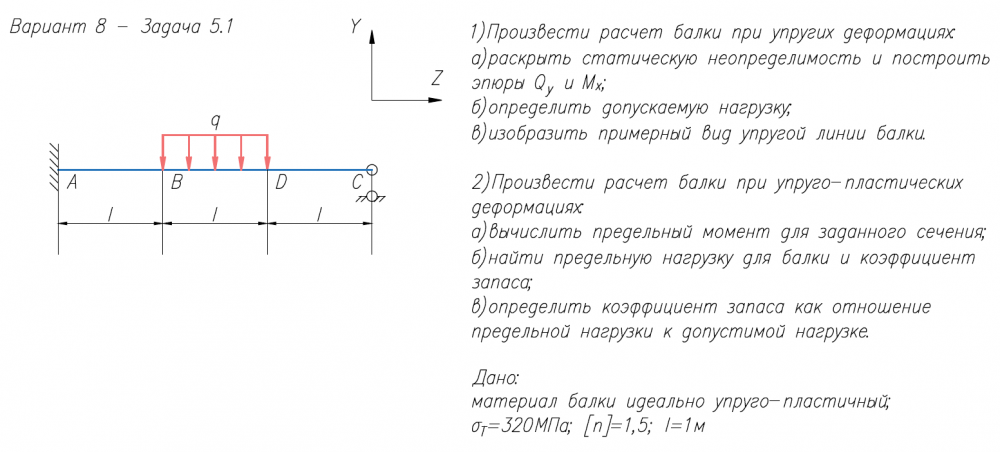 1)Произвести расчет балки при упругих деформациях: а)раскрыть статическую неопределимость и построить эпюры Q/y и M/x; б)определить допускаемую нагрузку; в)изобразить примерный вид упругой линии балки. 2)Произвести расчет балки при упруго-пластических деформациях: а)вычислить предельный момент для заданного сечения; б)найти предельную нагрузку для балки и коэффициент запаса; в)определить коэффициент запаса как отношение предельной нагрузки к допустимой нагрузке. Дано: материал балки идеально упруго-пластичный; σ/Т=320МПа; [n]=1,5; l=1м 1)Раскрыть статическую неопределимость и построить эпюру M/изг; 2)Найти линейное перемещение в направлении А-А или угловое перемещение в сечении В.