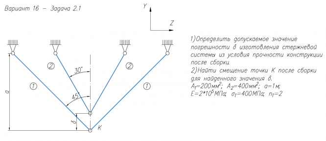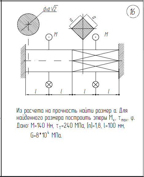 1)Определить допускаемое значение погрешности δ изготовления стержневой системы из условия прочности конструкции после сборки. 2)Найти смещение точки К после сборки для найденного значения δ. A/1=200мм2/; A/2=400мм2/; a=1м; E=2*105/МПа; σ/Т=400МПа; n/Т=2 1)Определить нагрузку, при которой в стержневой системе возникают первые пластические деформации. 2)Найти напряжения, возникающие в стержнях при найденной нагрузке. A=300мм2/; σ/Т=300МПа; E=2*105/МПа;  1)Из расчета на прочность найти размер a. 2)Для найденного размера построить эпюры М/к, τ/max, φ. М=140Нм; τ/Т=240МПа; n/Т=1,8; l=100мм; G=8*104/МПа.