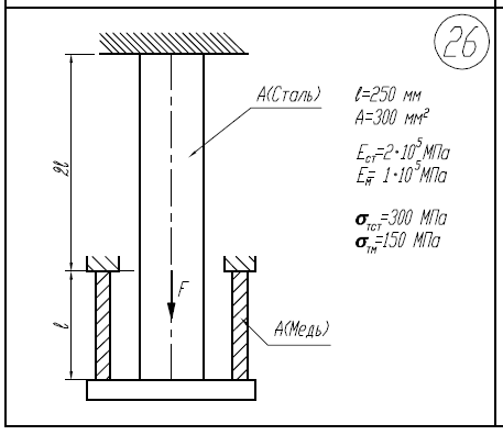 1)Построить эпюры N,σ,w для стержня, нагруженного силами F. 2)На сколько нужно изменить температуру всего стержня, чтобы сечения m-m и n-n остались неподвижными? F=48кН; l=400мм; E=2*105/МПа; A=100мм2/; α=12*10-6/1/град 1)Определить силу F, при которой в системе возникнут первые пластические деформации. 2)Построить эпюры N,σ,w для стержня и трубки при этом значении силы F. l=250мм; A=300мм2/; E/ст=2*105/МПа; E/м=1*105/МПа; σ/тст=300МПа; σ/тм=150МПа Построить в общем виде эпюры М/к, τ/max, φ. Определить длину Х, при которой сечение А-А повернется не более чем на 6,2*10-3/рад. Исходные данные для расчета: Материал: медь, d=10мм; τ/Т=50МПа; M=40Нм; l=0,1м;G=4,24*104/МПа.