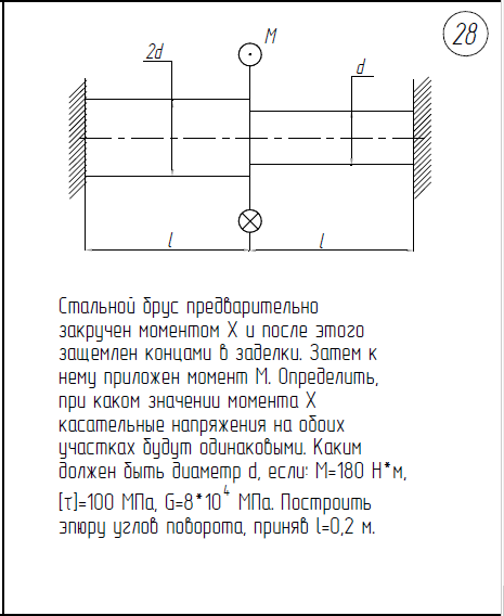 1)Построить эпюры N,σ,w для стержня, нагруженного силами F. 2)Подсчитать коэффициент запаса по текучести. *Стержень нарисован в недеформированном состоянии F=150кН; l=100мм; E=2*105/МПа; A=300мм2/; δ=0,1мм; σ/Т=300МПа 1)Определить нагрузку, при которой в стержневой системе возникают первые пластические деформации. 2)Найти напряжения, возникающие в стержнях при найденной нагрузке. l=400мм; A=1000мм2/; E=2*105/МПа; σ/Т=200МПа Стальной брус предварительно закручен моментом Х и после этого защемлен концами в заделке. Затем к нему приложен момент М. Определить, при каком значении момента Х касательные напряжения на обоих участках будут одинаковыми. Каким должен быть диаметр d, если: М=180Нм; [τ]=100МПа; G=8*104/МПа; l=0,2м .