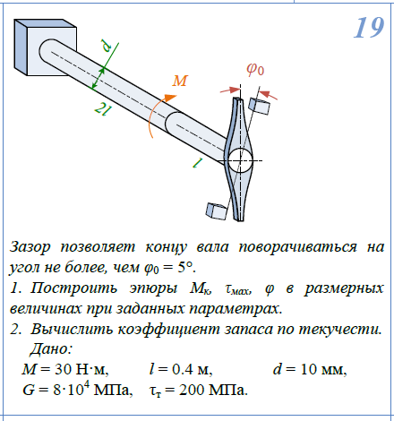 Построить эпюры М/к, τ/max, φ.; Зазор позволяет концу вала поворачиваться на угол не более, чем φ/0=5° 1. Построить эпюры М/к, τ/max, φ 2.Вычислить коэффициент запаса по текучести τ/Т=200МПа; d=10мм; l=0,4м=400мм; М=30Нм; G=8*104/МПа.