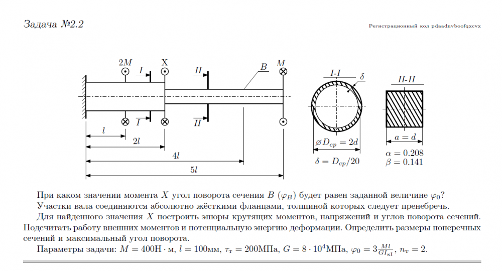 1)Построить эпюры N,σ,w для сплошного стержня и трубки при нагревании стержня на ΔT l=200мм; E/ст=2*105/МПа; E/м=1*105/МПа; A=300мм2/; α/ст=12*10-6/1/град; ΔT=50°С  1)Определить нагрузку, при которой в стержневой системе возникают первые пластические деформации. 2)Найти напряжения, возникающие в стержнях при найденной нагрузке. l=500мм; E=2*105/МПа; A=200мм2/; σ/Т=240МПа 1)Построить эпюры М/к, τ/max, φ 2)Из расчета на прочность найти размер d М=100Нм; [τ]=60МПа; l=200мм; G=8*104/МПа.