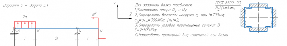 Для заданной балки требуется: 1)Построить эпюры Q/y и M/x. 2)Определить величину нагрузки при σ/Тр=σ/Тсж=240МПа; n/Т=1,5; l=1м 3)Определить угловое перемещение сечения К E=2*105/МПа 4)Нарисовать форму оси балки Для заданной балки требуется: 1)Построить эпюру моментов 2)Вычислить наибольшее нормальное напряжение в опасном сечении и определить коэффициент запаса по текучести (σ/Т=240МПа) 3)Построить эпюру нормальных напряжений в опасном сечении, изобразив сечение в масштабе 1:1 .