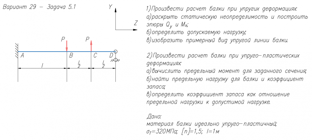 1)Произвести расчет балки при упругих деформациях: а)раскрыть статическую неопределимость и построить эпюры Q/y и M/x; б)определить допускаемую нагрузку; в)изобразить примерный вид упругой линии балки. 2)Произвести расчет балки при упруго-пластических деформациях: а)вычислить предельный момент для заданного сечения; б)найти предельную нагрузку для балки и коэффициент запаса; в)определить коэффициент запаса как отношение предельной нагрузки к допустимой нагрузке. Дано: материал балки идеально упруго-пластичный; σ/Т=320МПа; [n]=1,5; l=1м 1)Раскрыть статическую неопределимость и построить эпюру M/изг; 2)Найти линейное перемещение в направлении А-А или угловое перемещение в сечении В.