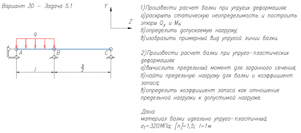 1)Произвести расчет балки при упругих деформациях: а)раскрыть статическую неопределимость и построить эпюры Q/y и M/x; б)определить допускаемую нагрузку; в)изобразить примерный вид упругой линии балки. 2)Произвести расчет балки при упруго-пластических деформациях: а)вычислить предельный момент для заданного сечения; б)найти предельную нагрузку для балки и коэффициент запаса; в)определить коэффициент запаса как отношение предельной нагрузки к допустимой нагрузке. Дано: материал балки идеально упруго-пластичный; σ/Т=320МПа; [n]=1,5; l=1м 1)Раскрыть статическую неопределимость и построить эпюру M/изг; 2)Найти линейное перемещение в направлении А-А или угловое перемещение в сечении В.