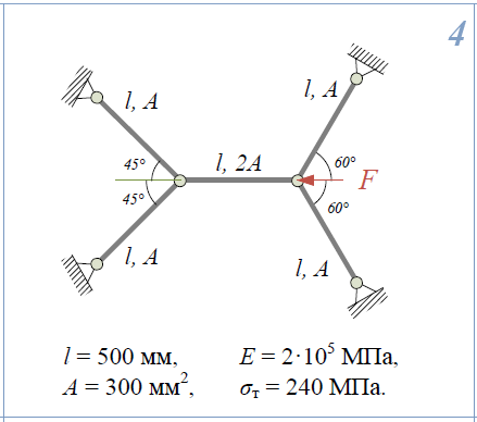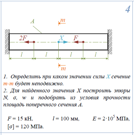Построить эпюры N,σ,w; 1)Определить при каком значении силы X сечение m-m будет неподвижно. 2)Для этого значения Х построить эпюры N,σ,w и подобрать из условия прочности площадь поперечного сечения А. F=15кН; l=100мм; E=2*105/МПа; [σ]=120МПа; 1)Определить нагрузку, при которой в стержневой системе возникают первые пластические деформации. 2)Найти напряжения, возникающие в стержнях при найденной нагрузке. l=500мм; E=2*105/МПа; A=300мм2/; σ/Т=240МПа.