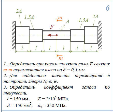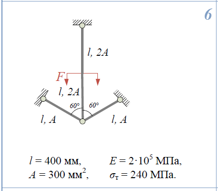 Построить эпюры N,σ,w; 1)Определить при каком значении силы F сечение m-m переместиться влево на 0,5 мм. 2)Для этого значения перемещения построить эпюры N,σ,w. 3)Определить коэффициент запаса по текучести. l=150мм; A=150мм2/; E=2*105/МПа; σ/Т=350МПа; 1)Определить нагрузку, при которой в стержневой системе возникают первые пластические деформации. 2)Найти напряжения, возникающие в стержнях при найденной нагрузке. l=400мм; E=2*105/МПа; A=300мм2/; σ/Т=240МПа.