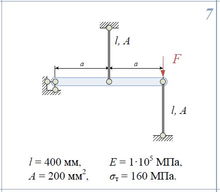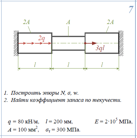 Построить эпюры N,σ,w; 1)Построить эпюры N,σ,w. 2)Найти коэффициент запаса по текучести. q=80кН/м; l=200мм; E=2*105/МПа; A=100мм2/; σ/Т=300МПа;  1)Определить нагрузку, при которой в стержневой системе возникают первые пластические деформации. 2)Найти напряжения, возникающие в стержнях при найденной нагрузке. l=400мм; E=1*105/МПа; A=200мм2/; σ/Т=160МПа.