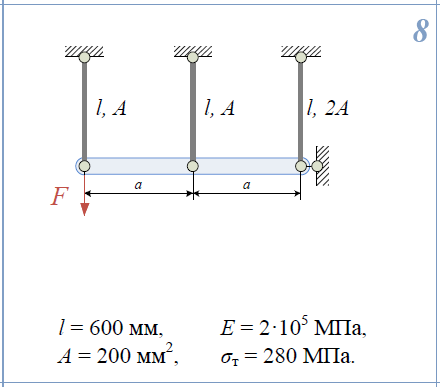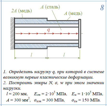 Построить эпюры N,σ,w; 1)Определить нагрузку q, при которой в системе возникнут первые пластические деформации. 2)Построить эпюры N,σ,w для стержня и трубки при этом значении нагрузки. l=200мм; E/ст=2*105/МПа; E/м=1*105/МПа; A=300мм2/; σ/тст=300МПа; σ/тм=150МПа; 1)Определить нагрузку, при которой в стержневой системе возникают первые пластические деформации. 2)Найти напряжения, возникающие в стержнях при найденной нагрузке. l=0,6м; E=2*105/МПа; A=200мм2/; σ/Т=280МПа.