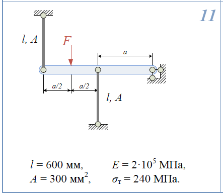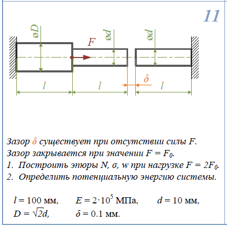Построить эпюры N,σ,w;  1)Зазор существует при отсутствии силы F. Зазок закрывается при значении F=F/0. 2)Построить эпюры N,σ,w для случая, когда F=2F/0. 3)Определить потенциальную энергию системы. l=100мм; E=2*105/МПа; d=10мм; D=d√2; δ=0,1мм. ;  1)Определить нагрузку, при которой в стержневой системе возникают первые пластические деформации. 2)Найти напряжения, возникающие в стержнях при найденной нагрузке. l=600мм; E=2*105/МПа; A=300мм2/; σ/Т=240МПа.
