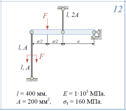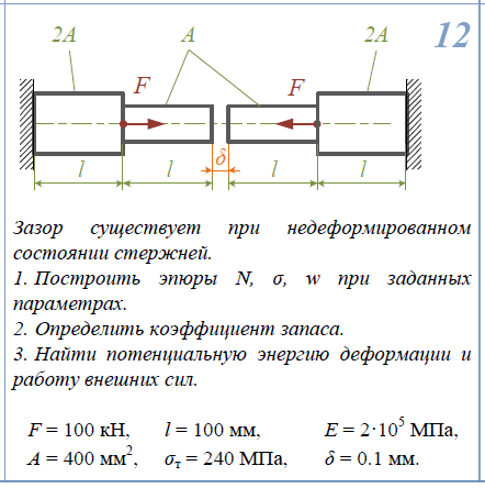 Построить эпюры N,σ,w; 1)В недеформированном состоянии между стержнями имеется зазор δ. 2)Построить эпюры N,σ,w. 3)Определить коэффициент запаса по текучести. 4)Найти потенциальную энергию деформации и работу внешних сил F=100кН; l=100мм; A=400мм2/; E=2*105/МПа; δ=0,1мм; σ/Т=240МПа ; 1)Определить нагрузку, при которой в стержневой системе возникают первые пластические деформации. 2)Найти напряжения, возникающие в стержнях при найденной нагрузке. l=400мм; E=1*105/МПа; A=200мм2/; σ/Т=160МПа.