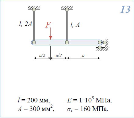 Построить эпюры N,σ,w; 1)В ненагруженном состоянии между стержнями имеется зазор δ. 2)Построить эпюры N,σ,w, если участок BC нагреть на ΔT. 3)При каком значении зазора δ величина максимального напряжения будет равна 100МПа. l=150мм; E=2*105/МПа; α/ст=12*10-6/1/град ΔT=100°С; 1)Определить нагрузку, при которой в стержневой системе возникают первые пластические деформации. 2)Найти напряжения, возникающие в стержнях при найденной нагрузке. l=200мм; E=1*105/МПа; A=300мм2/; σ/Т=160МПа.
