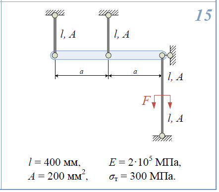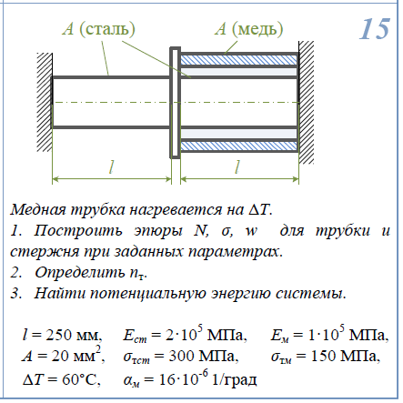 Построить эпюры N,σ,w; 1)Построить эпюры N,σ,w для стержня и трубки при нагревании трубки на ΔT. 2)Определить n/Т. 3)Найти потенциальную энергию системы. A=20мм2/; σ/тст=300МПа; σ/тм=150МПа; l=250мм; E/ст=2*105/МПа; E/ст=2E/м; ΔT=60°С α/м=16*10-6/1/град;  1)Определить нагрузку, при которой в стержневой системе возникают первые пластические деформации. 2)Найти напряжения, возникающие в стержнях при найденной нагрузке. l=0,4м; E=2*105/МПа; A=200мм2/; σ/Т=300МПа.