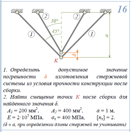 Построить эпюры N,σ,w;  1)Определить допускаемое значение погрешности δ изготовления стержневой системы из условия прочности конструкции после сборки. 2)Найти смещение точки К после сборки для найденного значения δ. A/1=200мм2/; A/2=400мм2/; a=1м; E=2*105/МПа; σ/Т=400МПа; n/Т=2; 1)Определить нагрузку, при которой в стержневой системе возникают первые пластические деформации. 2)Найти напряжения, возникающие в стержнях при найденной нагрузке. 3)Построить эпюры N,σ,w..