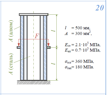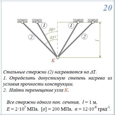 Построить эпюры N,σ,w; Стальные стержни (2) нагреваются на ΔТ. 1.Определить допустимую степень нагрева из условия прочности конструкции. 2.Найти перемещение узла К. l=1м; [σ/Т]=200МПа; E=2*105/МПа; α=12*10-6/1/град; 1)Определить нагрузку, при которой в стержневой системе возникают первые пластические деформации. 2)Найти напряжения, возникающие в стержнях при найденной нагрузке. 3)Построить эпюры N,σ,w. l=500мм; A=300мм2/; E/ст=2,1*105/МПа; E/ал=0,7*105/МПа; σ/тст=360МПа; σ/тал=180МПа.