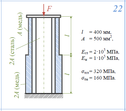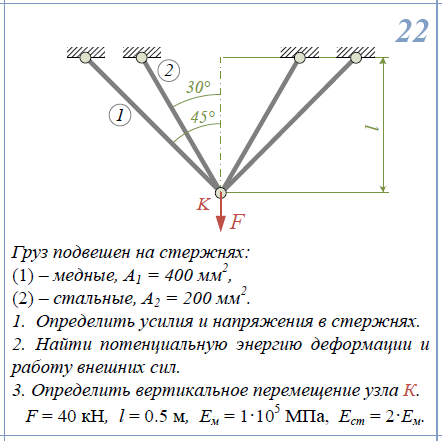 Построить эпюры N,σ,w; Груз подвешен на стержнях: (1) – медные, А/м=400мм2/ (2) – стальные, А/ст=200мм2/ 1.Определить усилия и напряжения в стержнях. 2.Найти потенциальную энергию деформации и работу внешних сил. 3. Определить вертикальное перемещение узла К. F=40кН; l=0,5м; E/м=1*105/МПа; E/ст=2E/м=2*105/МПа; 1)Определить нагрузку, при которой в стержневой системе возникают первые пластические деформации. 2)Найти напряжения, возникающие в стержнях при найденной нагрузке. 3)Построить эпюры N,σ,w. l=400мм; A=500мм2/; E/ст=2*105/МПа; E/м=1*105/МПа; σ/тст=320МПа; σ/тм=160МПа.