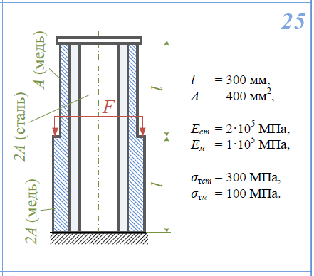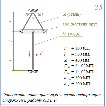 Построить эпюры N,σ,w; Определить потенциальную энергию деформации стержней и работу силы F. F=100кН; l=500мм; А=400мм2/; E/ст=2*105/МПа; E/м=1*105/МПа; σ/Тст=300МПа; σ/Тм=200МПа;;  1)Определить нагрузку, при которой в стержневой системе возникают первые пластические деформации. 2)Найти напряжения, возникающие в стержнях при найденной нагрузке. 3)Построить эпюры N,σ,w. l=300мм; A=400мм2/; E/ст=2*105/МПа; E/м=1*105/МПа; σ/тст=300МПа; σ/тм=100МПа.