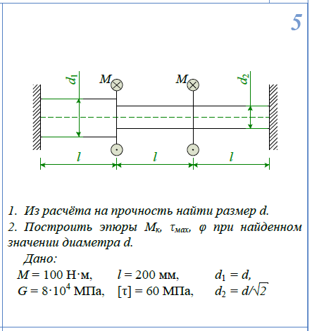 Построить эпюры М/к, τ/max, φ.;  1. Из расчета на прочность найти размер d. 2. Построить эпюры М/к, τ/max, φ. d/1=d; d/2=d/√2≈0,7d; М=100Нм; [τ]=60МПа; l=200мм; G=8*104/МПа.