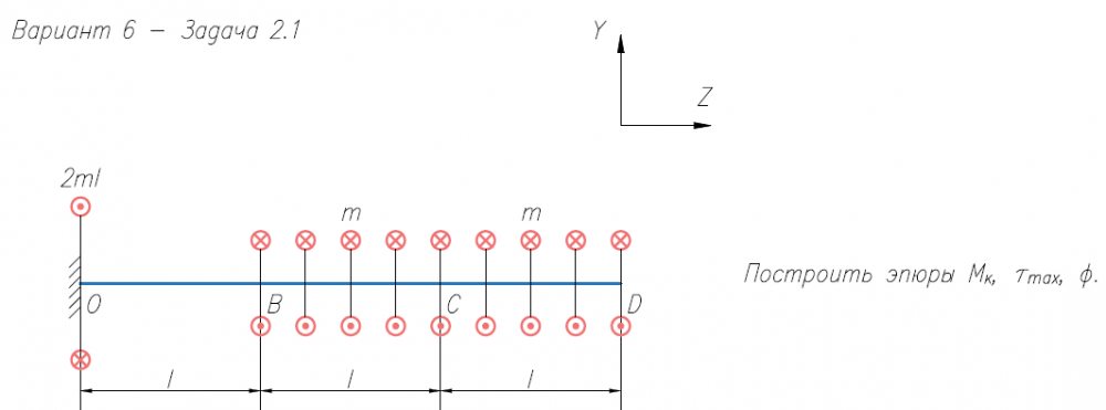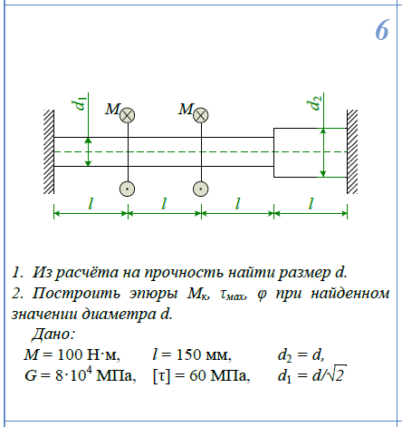 Построить эпюры М/к, τ/max, φ.;  1. Из расчета на прочность найти размер d. 2. Построить эпюры М/к, τ/max, φ М=100Нм; [τ]=60МПа; l=200мм; G=8*104/МПа; d/1=d/√2≈0,7d; d/2=d.