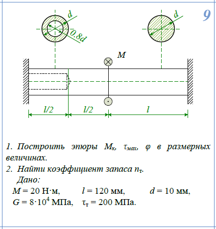 Построить эпюры М/к, τ/max, φ.;  1. Построить эпюры М/к, τ/max, φ 2. Найти коэффициент запаса n/Т М=20Нм; τ/Т=200МПа; d=10мм; l=120мм; G=8*104/МПа.