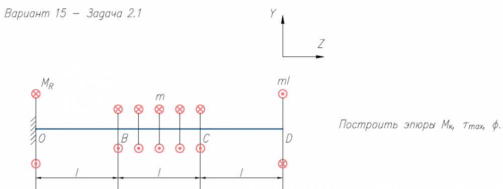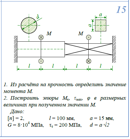 Построить эпюры М/к, τ/max, φ.;  1. Из расчета на прочность найти М. 2. Для найденного значения М построить эпюры М/к, τ/max, φ. τ/Т=200МПа; n/Т=2; l=100мм; a=15мм; G=8*104/МПа; d=a√2.