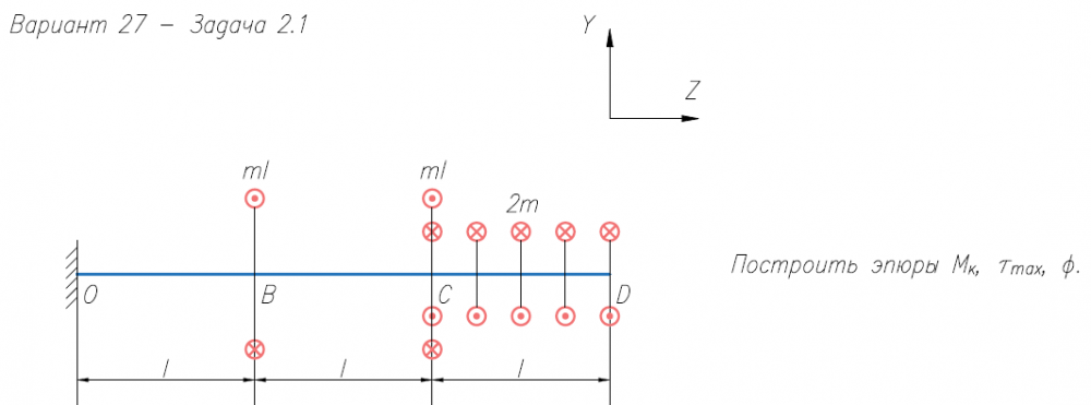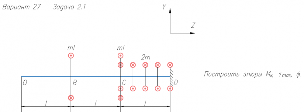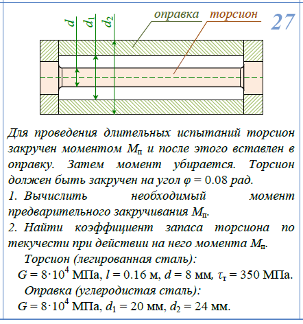 Построить эпюры М/к, τ/max, φ.;   Для проведения длительных испытаний торсион 1 закручен моментом М/П и после этого вставлен в оправку 2. Затем момент убирается. Торсион должен быть закручен на угол φ=0,08рад. 1. Вычислить необходимый момент предварительного закручивания М/П 2. Найти коэффициент запаса торсиона по текучести n/Т при действии на него момента М/П Торсион (легированная сталь): G=8*104/МПа; l=0,16м; d=8мм; τ/Т=350МПа Оправка (углеродистая сталь): G=8*104/МПа; d/1=20мм; d/2=24мм.