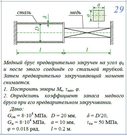 Построить эпюры М/к, τ/max, φ.;   Медный брус предварительно закручен на угол φ/0 и после этого соединен со стальной трубкой. Затем предварительно закручивающий момент снимается. 1. Построить эпюры М/к, τ/max, φ 2. Определить коэффициент запаса медного бруса при его предварительном закручивании. G/ст=8*104/МПа; D=20мм; δ=D/20; G/м=4*104/МПа; a=10мм; τ/Тм=50МПа φ=0,018рад; l=0,2м.