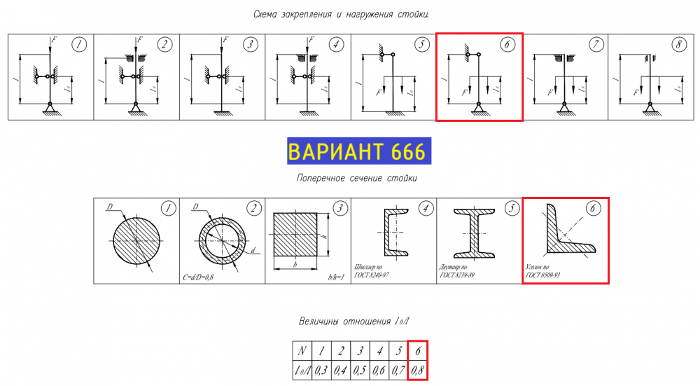 Примечание: Задание задается трехзначным числом. Первая цифра определяет номер закрепления и нагружения стойки, вторая цифра - номер поперечного сечения, третья - величину соотношения l0/l