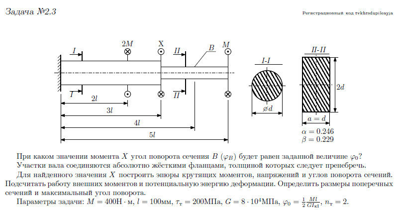 Определить размеры поперечных сечений и максимальный угол поворота. M=400Нм; l=100мм; τ/Т=200МПа; G=8*104/МПа φ/0=Мl/2GIk1; n/Т=2; α=0,246; β=0,229..