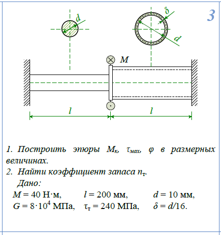 Построить эпюры М/к, τ/max, φ.;  1)Построить эпюры М/к, τ/max, φ 2)Найти коэффициент запаса n/Т М=40Нм; τ/Т=240МПа; d=10мм; l=200мм; G=8*104/МПа D=2d; δ=d/16.