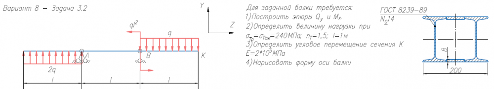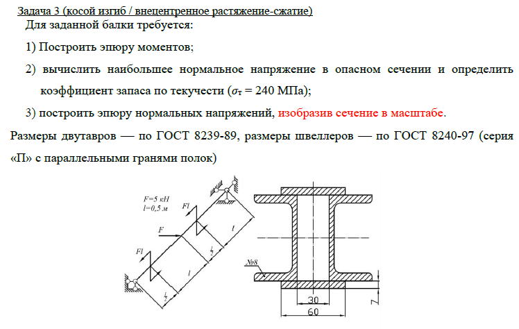 Задача 2 (прямой изгиб) Для заданной балки требуется: 1) Построить эпюры Qy и Mx; 2) Нарисовать форму изогнутой оси балки; 3) Определить величину нагрузки при σтр = σтс = 240 МПа, nт = 1.5, l = 1м; 4) Определить угловое перемещение сечения К (при Е = 2х105 МПа) (методом Коши-Крылова и способом Верещагина). Задача 3 (косой изгиб / внецентренное растяжение-сжатие) Для заданной балки требуется: 1) Построить эпюру моментов; 2) вычислить наибольшее нормальное напряжение в опасном сечении и определить коэффициент запаса по текучести (σт = 240 МПа); 3) построить эпюру нормальных напряжений, изобразив сечение в масштабе. Размеры двутавров ⎯ по ГОСТ 8239-89, размеры швеллеров ⎯ по ГОСТ 8240-97 (серия «П» с параллельными гранями полок).