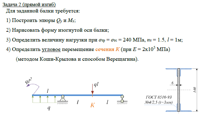 Задача 2 (прямой изгиб) Для заданной балки требуется: 1) Построить эпюры Qy и Mx; 2) Нарисовать форму изогнутой оси балки; 3) Определить величину нагрузки при σтр = σтс = 240 МПа, nт = 1.5, l = 1м; 4) Определить угловое перемещение сечения К (при Е = 2х105 МПа) (методом Коши-Крылова и способом Верещагина). Задача 3 (косой изгиб / внецентренное растяжение-сжатие) Для заданной балки требуется: 1) Построить эпюру нормальных напряжений в поперечном сечении, изобразив сечение в масштабе; 2) Определить коэффициент запаса по текучести (σт = 240 МПа)..