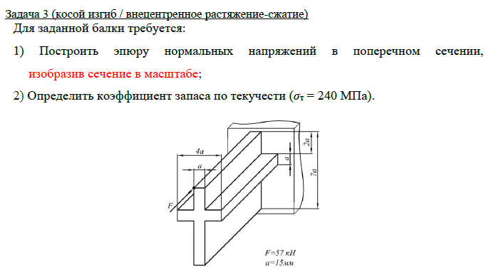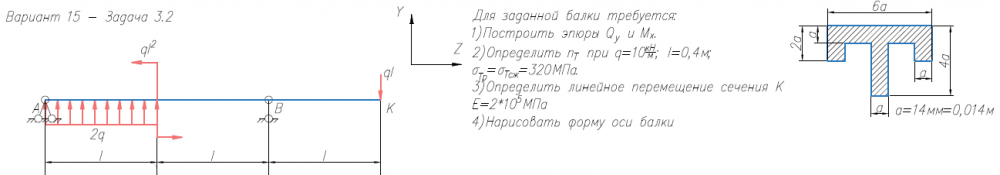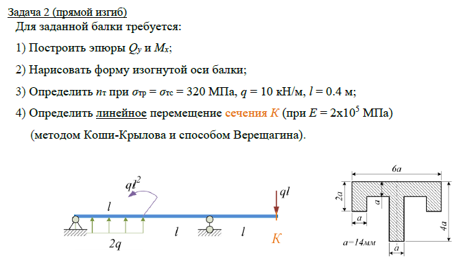 Задача 2 (прямой изгиб) Для заданной балки требуется: 1) Построить эпюры Qy и Mx; 2) Нарисовать форму изогнутой оси балки; 3) Определить nт при σтр = σтс = 320 МПа, q = 10 кН/м, l = 0.4 м; 4) Определить линейное перемещение сечения К (при Е = 2х105 МПа) (методом Коши-Крылова и способом Верещагина). Задача 3 (косой изгиб / внецентренное растяжение-сжатие) Для заданной балки требуется: 1) Построить эпюру нормальных напряжений в поперечном сечении, изобразив сечение в масштабе; 2) Определить коэффициент запаса по текучести (σт = 240 МПа)..