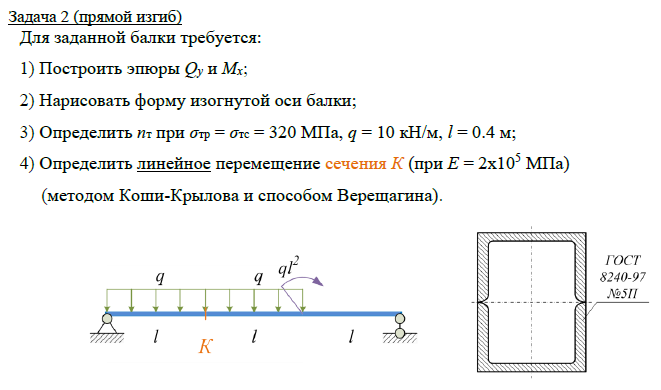 Задача 2 (прямой изгиб) Для заданной балки требуется: 1) Построить эпюры Qy и Mx; 2) Нарисовать форму изогнутой оси балки; 3) Определить nт при σтр = σтс = 320 МПа, q = 10 кН/м, l = 0.4 м; 4) Определить линейное перемещение сечения К (при Е = 2х105 МПа) (методом Коши-Крылова и способом Верещагина). Задача 3 (косой изгиб / внецентренное растяжение-сжатие) Для заданной балки требуется: 1) Построить эпюру моментов; 2) вычислить наибольшее нормальное напряжение в опасном сечении и определить коэффициент запаса по текучести (σт = 240 МПа); 3) построить эпюру нормальных напряжений, изобразив сечение в масштабе. Размеры двутавров ⎯ по ГОСТ 8239-89, размеры швеллеров ⎯ по ГОСТ 8240-97 (серия «П» с параллельными гранями полок).