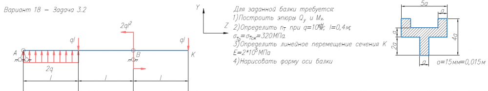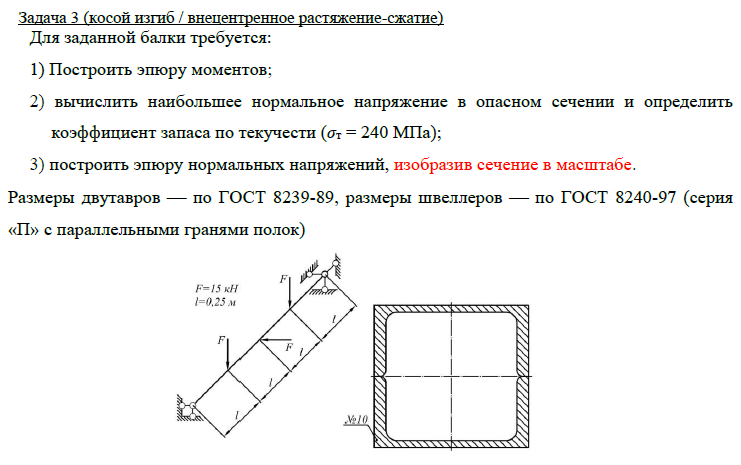 Задача 2 (прямой изгиб) Для заданной балки требуется: 1) Построить эпюры Qy и Mx; 2) Нарисовать форму изогнутой оси балки; 3) Определить nт при σтр = σтс = 320 МПа, q = 10 кН/м, l = 0.4 м; 4) Определить линейное перемещение сечения К (при Е = 2х105 МПа) (методом Коши-Крылова и способом Верещагина). Задача 3 (косой изгиб / внецентренное растяжение-сжатие) Для заданной балки требуется: 1) Построить эпюру моментов; 2) вычислить наибольшее нормальное напряжение в опасном сечении и определить коэффициент запаса по текучести (σт = 240 МПа); 3) построить эпюру нормальных напряжений, изобразив сечение в масштабе. Размеры двутавров ⎯ по ГОСТ 8239-89, размеры швеллеров ⎯ по ГОСТ 8240-97 (серия «П» с параллельными гранями полок).