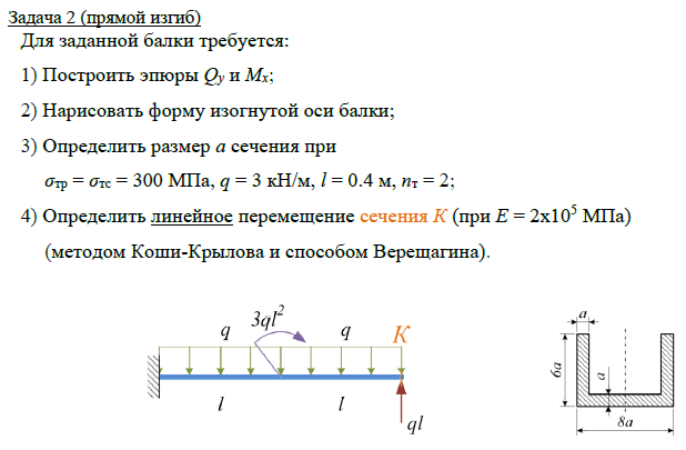 Задача 2 (прямой изгиб) Для заданной балки требуется: 1) Построить эпюры Qy и Mx; 2) Нарисовать форму изогнутой оси балки; 3) Определить размер а сечения при σтр = σтс = 300 МПа, q = 3 кН/м, l = 0.4 м, nт = 2; 4) Определить линейное перемещение сечения К (при Е = 2х105 МПа) (методом Коши-Крылова и способом Верещагина). Задача 3 (косой изгиб / внецентренное растяжение-сжатие) Для заданной балки требуется: 1) Построить эпюру моментов; 2) вычислить наибольшее нормальное напряжение в опасном сечении и определить коэффициент запаса по текучести (σт = 240 МПа); 3) построить эпюру нормальных напряжений, изобразив сечение в масштабе. Размеры двутавров ⎯ по ГОСТ 8239-89, размеры швеллеров ⎯ по ГОСТ 8240-97 (серия «П» с параллельными гранями полок).