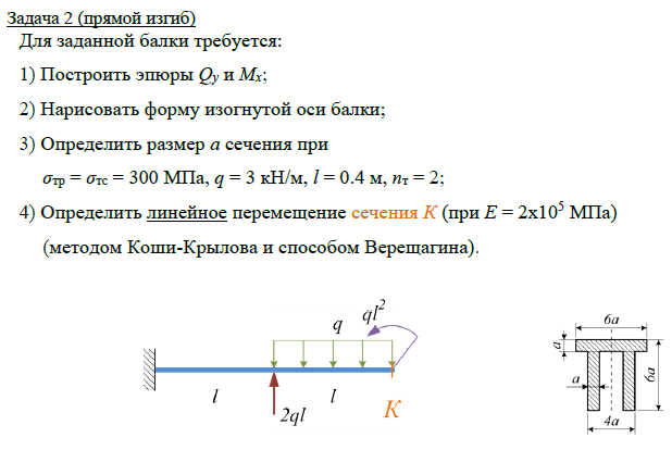 Задача 2 (прямой изгиб) Для заданной балки требуется: 1) Построить эпюры Qy и Mx; 2) Нарисовать форму изогнутой оси балки; 3) Определить размер а сечения при σтр = σтс = 300 МПа, q = 3 кН/м, l = 0.4 м, nт = 2; 4) Определить линейное перемещение сечения К (при Е = 2х105 МПа) (методом Коши-Крылова и способом Верещагина). Задача 3 (косой изгиб / внецентренное растяжение-сжатие) Для заданной балки требуется: 1) Построить эпюру нормальных напряжений в поперечном сечении, изобразив сечение в масштабе; 2) Определить коэффициент запаса по текучести (σт = 240 МПа)..