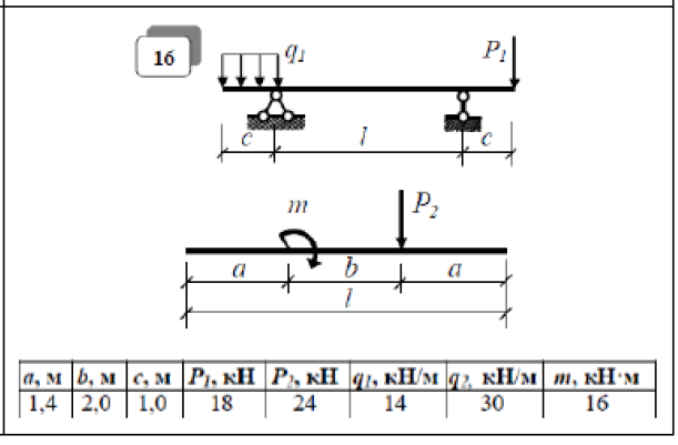 3.В сечениях, где Q = 0, изгибающий момент М может иметь экстремум. 4.В точке приложения сосредоточенной силы эпюра Q имеет скачок, равный по величине, приложенной в этой точке силе, а эпюра моментов М имеет излом. 5.В точке приложения сосредоточенного момента эпюра М имеет скачок, равный по величине приложенному моменту. В графической части задания необходимо на отдельном листе формата А4 изобразить схему стержня с геометрическими размерами и приложенными нагрузками, а также определенные из уравнений статики опорные реакции. Эпюры штрихуются прямыми линиями, перпендикулярными к оси стержня и указываются знаки внутренних усилий. В пояснительной записке приводятся необходимые расчеты по определению опорных реакций и вычислению значений внутренних усилий в рассматриваемых сечениях стержней.