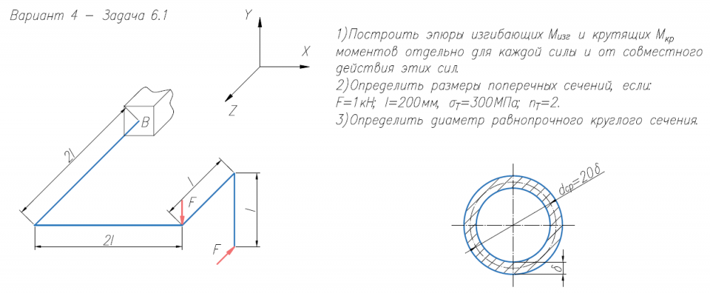 Задача 6.1 Построить эпюры изгибающих M/изг и крутящих M/кр моментов отдельно для каждой силы и от совместного действия этих сил. 2)Определить размеры поперечных сечений, если: F=1кН; l=200мм, σ/Т=300МПа; n/Т=2. 3)Определить диаметр равнопрочного круглого сечения. Задача 6.2. Для деталей, изображенных на чертежах и указанных в тексте задач, требуется: 1)Определить напряженное состояние в наиболее нагруженных точках. 2)Исследовать напряженное состояние в этих точках аналитически и графически. 3)Определить коэффициент запаса. Тонкостенная трубка AB проходит через камеру, в которой поддерживается давление P и закручивается моментом M. Изучить состояние трубки. Материал трубки - бронза, σ/Т=200МПа; Вариант А: P=2МПа; M=40Нм; D=20мм; δ=1мм.