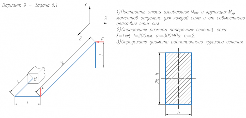 Задача 6.1 Построить эпюры изгибающих M/изг и крутящих M/кр моментов отдельно для каждой силы и от совместного действия этих сил. 2)Определить размеры поперечных сечений, если: F=1кН; l=200мм, σ/Т=300МПа; n/Т=2. 3)Определить диаметр равнопрочного круглого сечения. Задача 6.2. Для деталей, изображенных на чертежах и указанных в тексте задач, требуется: 1)Определить напряженное состояние в наиболее нагруженных точках. 2)Исследовать напряженное состояние в этих точках аналитически и графически. 3)Определить коэффициент запаса. Тонкостенная замкнутая трубка подвергается действию внутреннего давления P и моментов M, изгибающих трубку. Изучить напряженное состояние трубки в области, достаточно удаленной от ее концов.