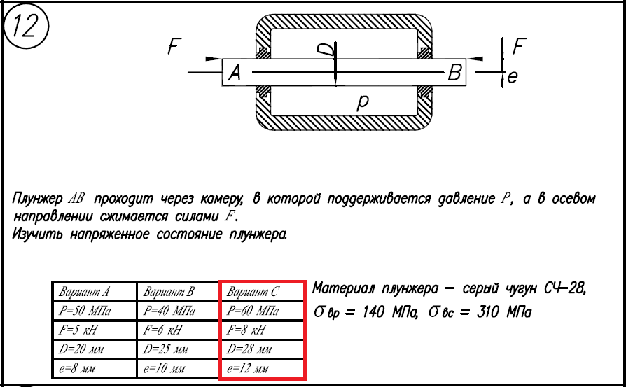 Материал плунжера - сечрый чугун СЧ-28, σ/вр=140МПа; σ/вс=310МПа; Вариант C: P=60МПа; F=8кН; D=28мм; e=12мм.