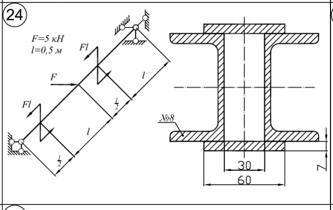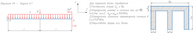 Для заданной балки требуется: 1)Построить эпюры Q/y и M/x. 2)Определить размер а сечения при q=3кН/м; l=0,4м; n/Т=2; σ/Тр=σ/Тсж=300МПа. 3)Определить линейное перемещение сечения К E=2*105/МПа 4)Нарисовать форму оси балки Для заданной балки требуется: 1)Построить эпюру моментов 2)Вычислить наибольшее нормальное напряжение в опасном сечении и определить коэффициент запаса по текучести (σ/Т=240МПа) 3)Построить эпюру нормальных напряжений в опасном сечении, изобразив сечение в масштабе 1:1 .